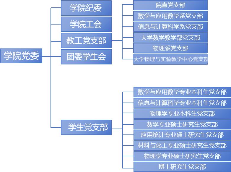 学院党委现设有党支部14个,其中教工党支部6个,学生党支部8个;现有党员332人,其中教工党员85人,学生党员247人,教师党支部书记“双带头人”达到100%,数学与应用数学专业本科生党支部获批学校第一批”样板支部“,已通过验收;物理实验中心党支部获批学校第二批”样板支部”,大学物理与实验中心党支部获批学校第二批“双带头人”教师党支部书记工作室。
