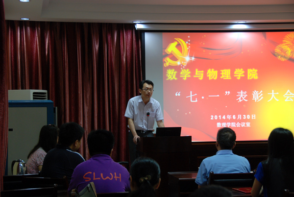 2014年6月30日上午10点半,91短视频 在基础楼二楼报告厅召开了庆祝建党93周年暨“七一”表彰大会,校党委组织部副部长刘治国、院党委书记李宇凯、副院长张光勇、副书记李杰出席表彰大会。参加表彰大会的还有教工党员和学生党员代表。