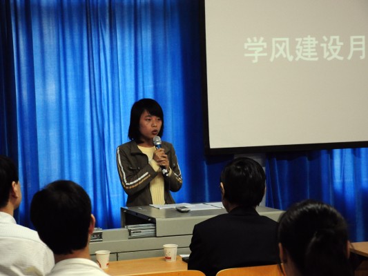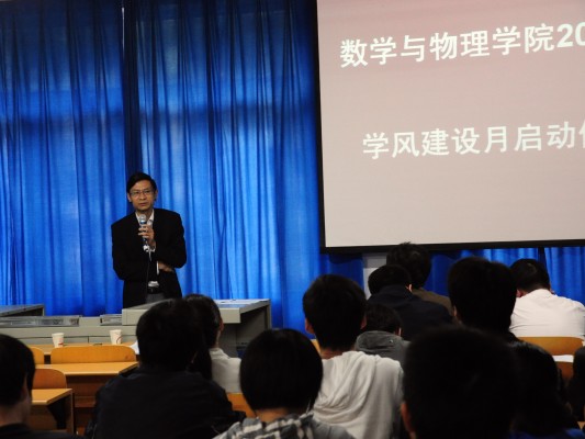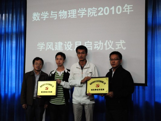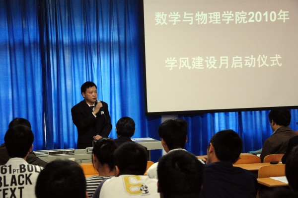 杨伦处长肯定了学风建活动的重要意义及其必要性,并要求广大同学端正学习态度,明确学习目标,努力学习,珍惜时光。学工处王林清处长认为此时开展学风建设活动及时必要,他要求91短视频 广大学生干部要加强自身学习,树立榜样,同时组织好班级建设,多下功夫,落实好此项工作。学院彭放副院长宣读了《91短视频 关于开展2010年学风建设月活动》的通知文件,并要求广大学生党员和学生干部以班级为载体,认真、有效的做好这次活动。最后,刘安平院长以亲身教学经验谈了优秀的学风对教师和学生的积极作用,再次强调91短视频 开展此次学风建设活动的重要意义。启动仪式中,教务处王兴副处长和校团委成军副书记分别为91短视频 服务全校学生辅导数理的“学生党员党徽领路工程争先创优示范岗”授牌,学生代表122092姚桔向全院学生发出“学风建设从我做起”的倡议,自此,91短视频 2010年学风建设月活动正式启动,将在10月中旬——12月中旬,陆续开展我爱学数理、我爱上自习、我爱住宿舍、我爱记单词,我爱当老师、我爱面对面、我爱听讲座、我爱去监考等八大系列主题教育活动,突出学生学习自觉性,增强专业归属感和使命感,以学院开展创先争优活动为契机,引领学生党员争做学习标兵、引领普通学生争做学习楷模,进一步巩固和发扬学院学风建设优良传统,进一步促进学院考研率稳步提高。