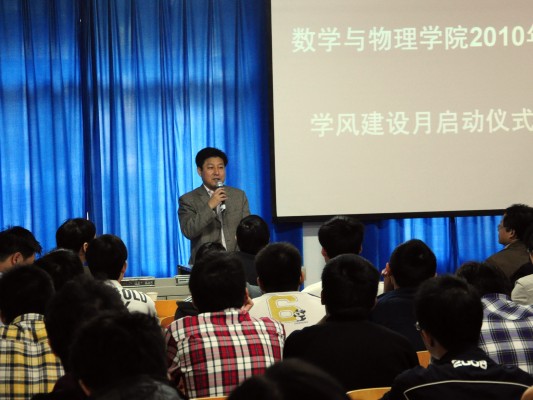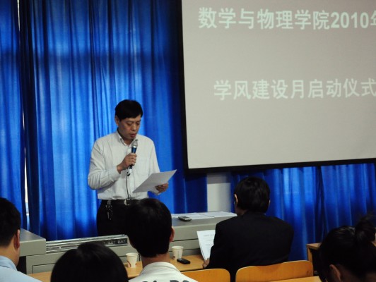 10月20日,91短视频 2010年“学风建设月”启动仪式在数理楼二楼会议室成功举行。教务处杨伦处长、学工处王林清处长,教务处王兴副处长,校团委成军副书记,学院刘安平院长,彭放副院长、以及学院各教研室主任应邀出席此次活动。院党委副书记李杰主持会议。