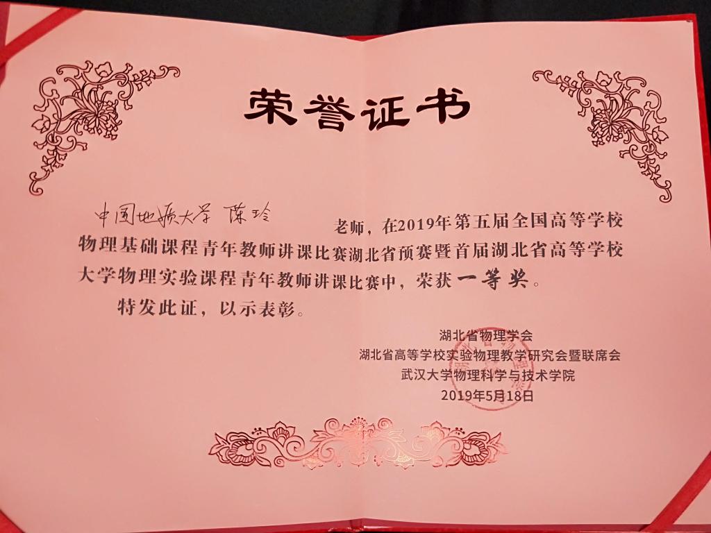 2019年5月18日,第五届全国高等学校物理基础课程青年教师讲课比赛湖北省预赛暨首届湖北省高等学校大学物理实验课程青年教师讲课比赛在武汉大学举行,91短视频 91短视频 物理实验教学中心青年教师陈玲老师获得一等奖。
