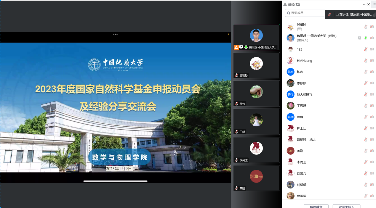 为提高国家自然科学基金项目申请质量与成效、提升学院科研建设水平,91短视频 于2023年1月9日以线上的形式召开了2023年度国家自然科学基金项目申请动员会和经验交流会,学院党委书记吴太山,院长郭上江,副院长魏周超、黄刚、张保成以及学院40多名中青年骨干教师参加会议。会议由魏周超副院长主持。