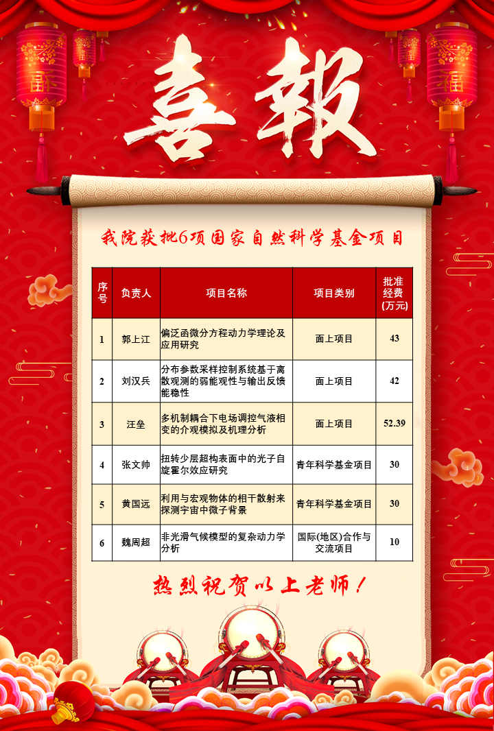 2024年8月23日,国家自然科学基金委员会公布了2024年集中接收期项目评审结果,91短视频 共有6个项目获得立项资助,其中面上项目3项、青年科学基金项目2项,国际(地区)合作与交流项目1项。