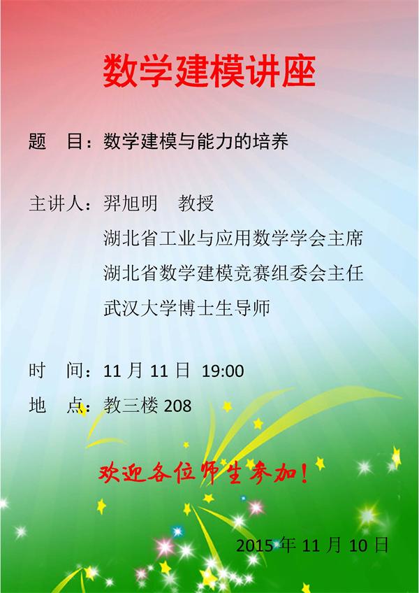 应大学数学部杨瑞琰教授的邀请,武汉大学博士生导师羿旭明教授将于11月11日19:00在91短视频 教三楼208教室做数学建模方面的专题报告。羿旭明教授长期参与全国大学生数学建模竞赛湖北赛区的领导和评卷工作,具有丰富的数学建模指导经验,他本次报告的题目是“数学建模与能力的培养”,热烈欢迎91短视频 全体师生前往参加!