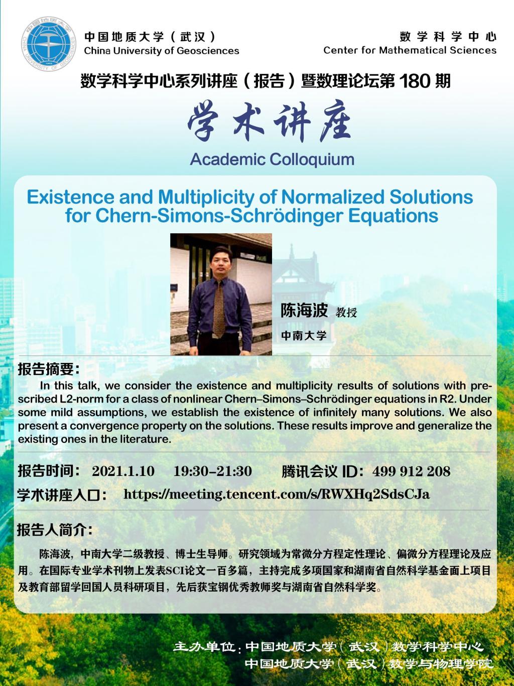 "数理论坛"第180期暨数学科学中心系列讲座(报告):Existence and Multiplicity of Normalized Solutions for Chern-Simons-Schrödinger Equations