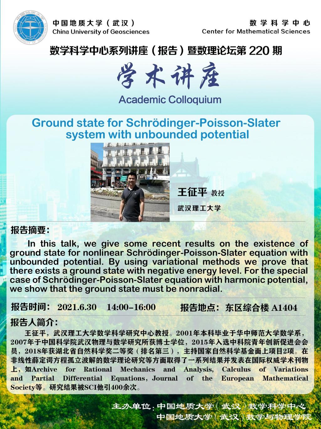 "数理论坛"第220期暨数学科学中心系列讲座(报告):Ground state for Schrödinger-Poisson-Slater system with unbounded potential