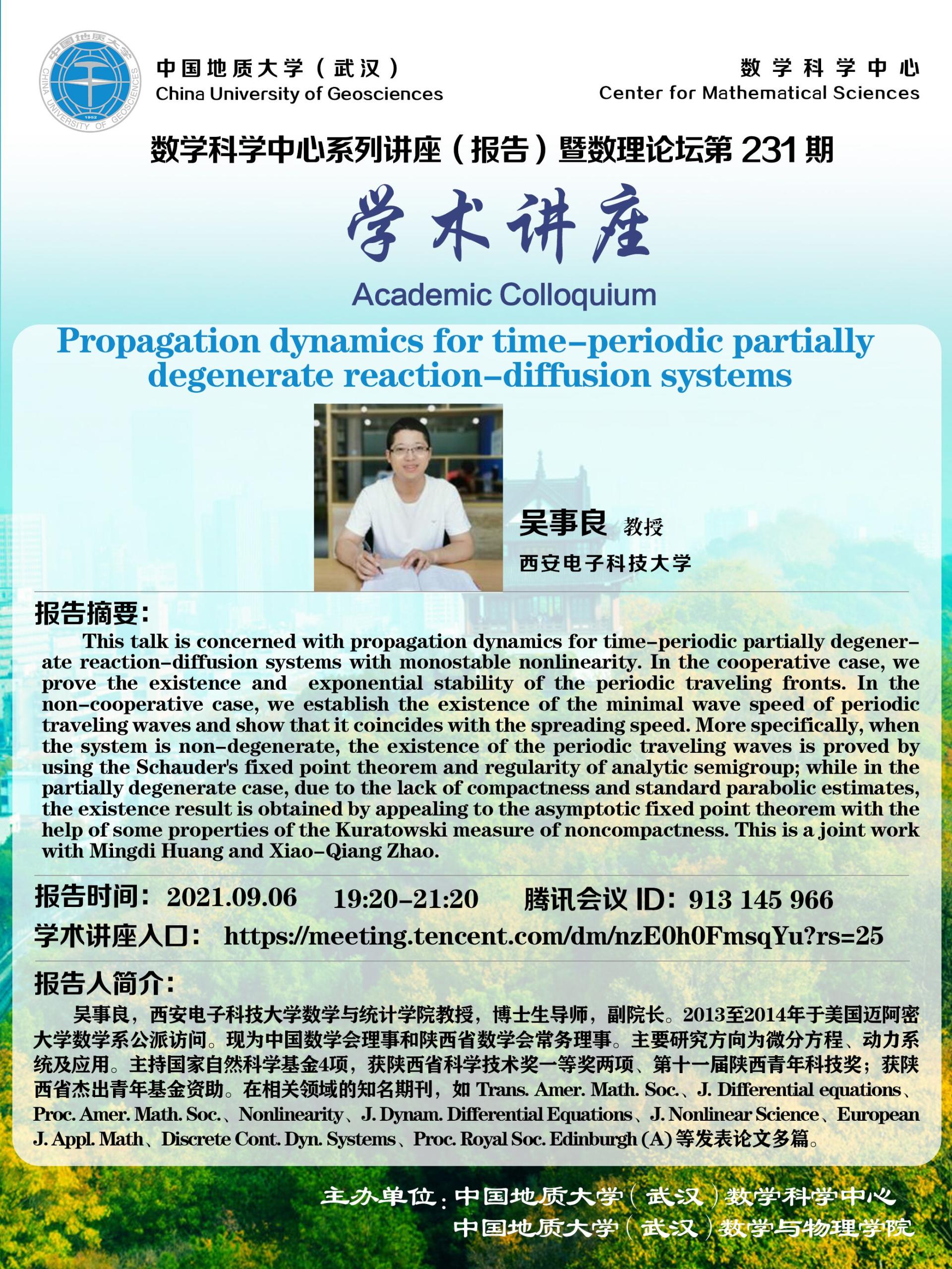 "数理论坛"第231期暨数学科学中心系列讲座(报告):Propagation dynamics for time-periodic partially degenerate reaction-diffusion systems