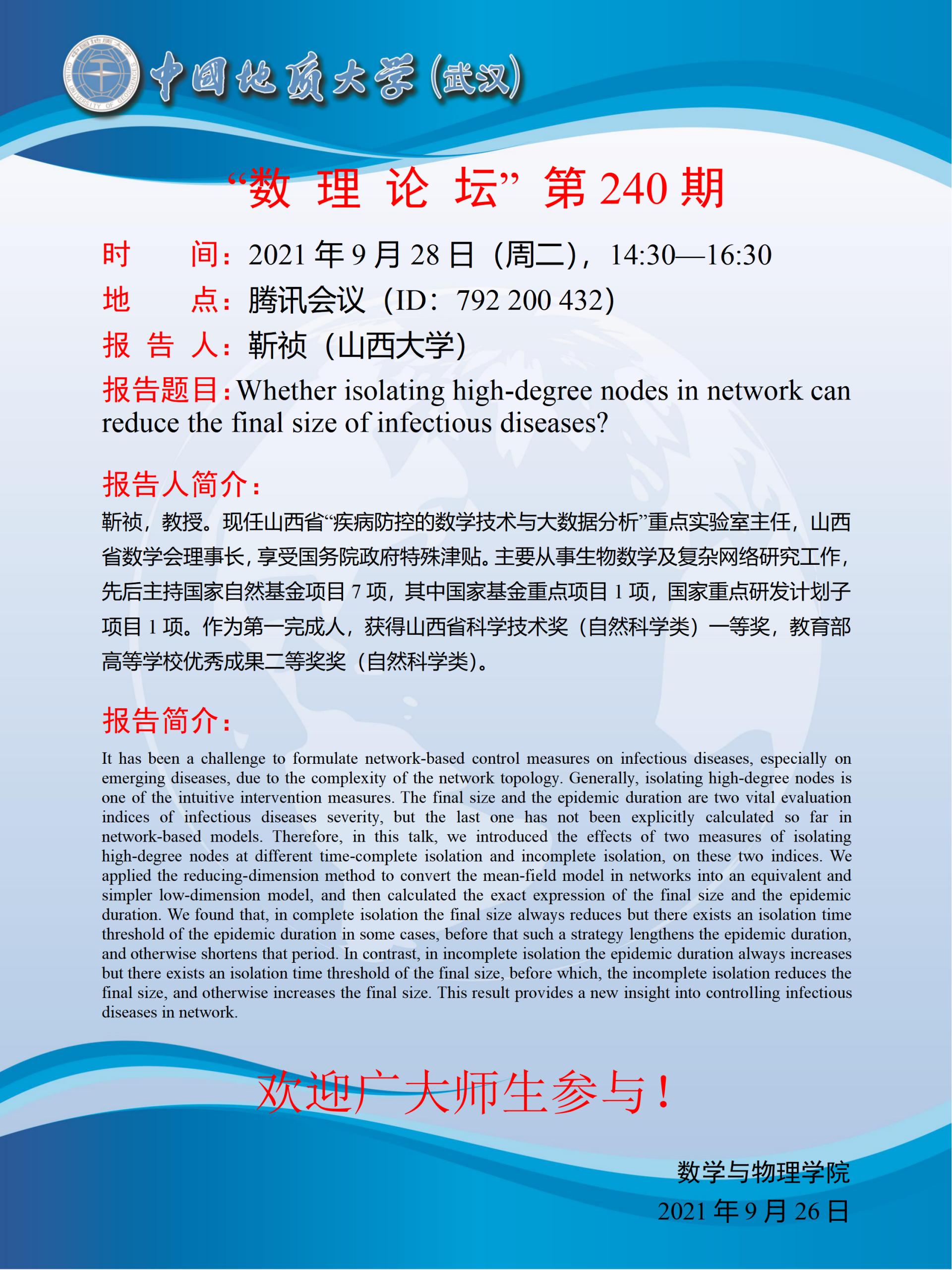 "数理论坛"第240期:Whether isolating high-degree nodes in network can reduce the final size of infectious diseases?