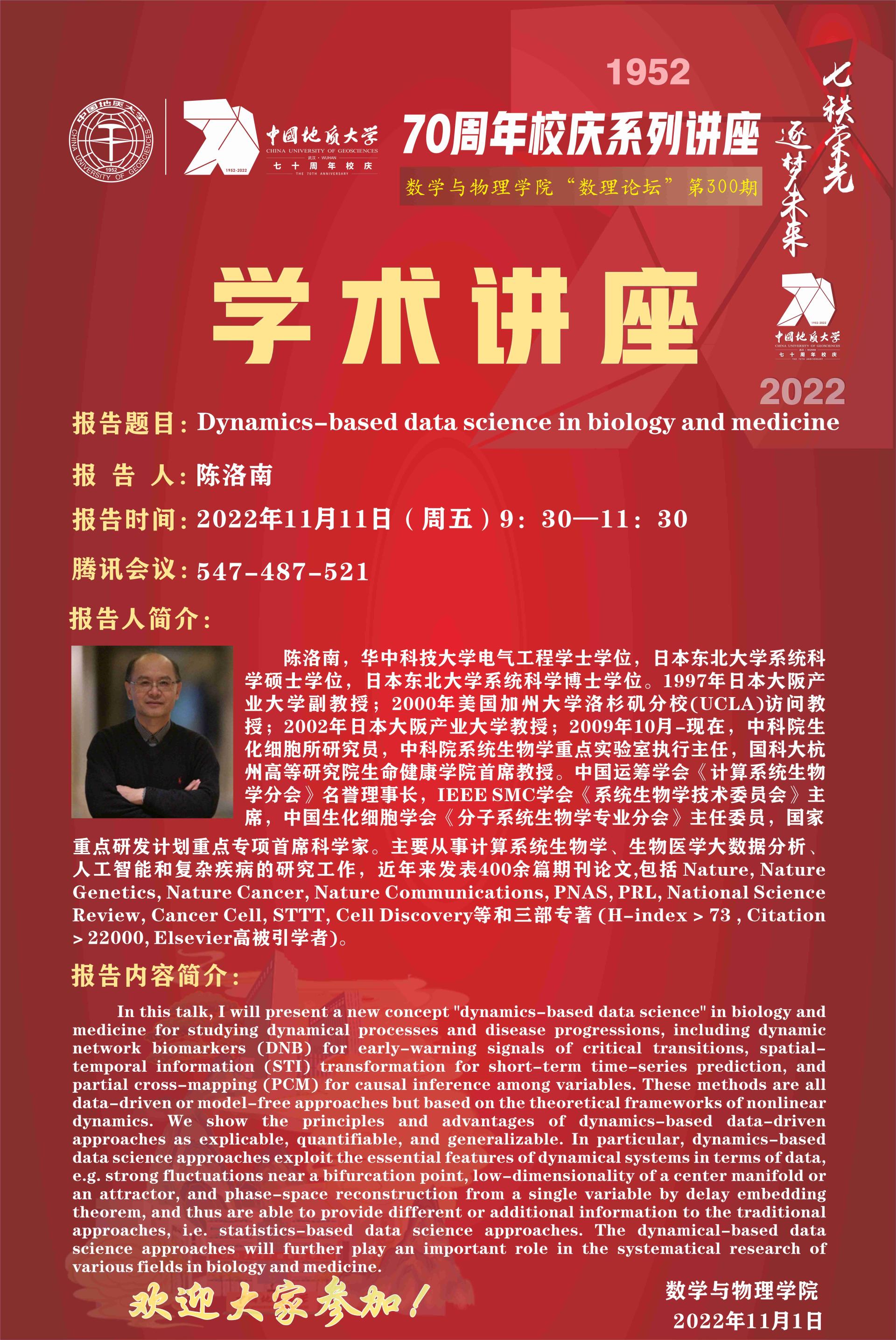"数理论坛"第300期:Dynamics-based data science in biology and medicine