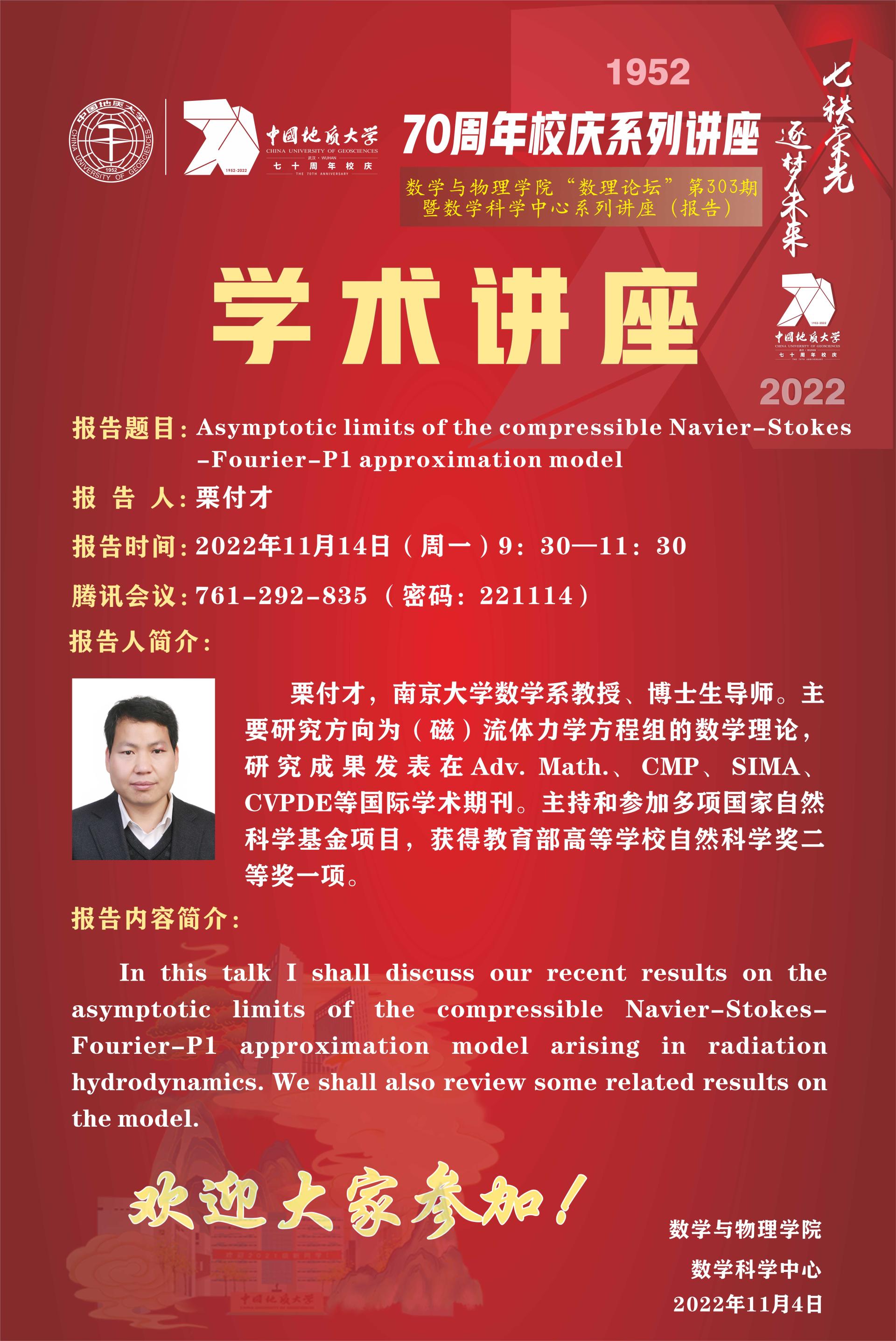"数理论坛"第303期暨数学科学中心系列讲座(报告):Asymptotic limits of the compressible Navier-Stokes-Fourier-P1 approximation model