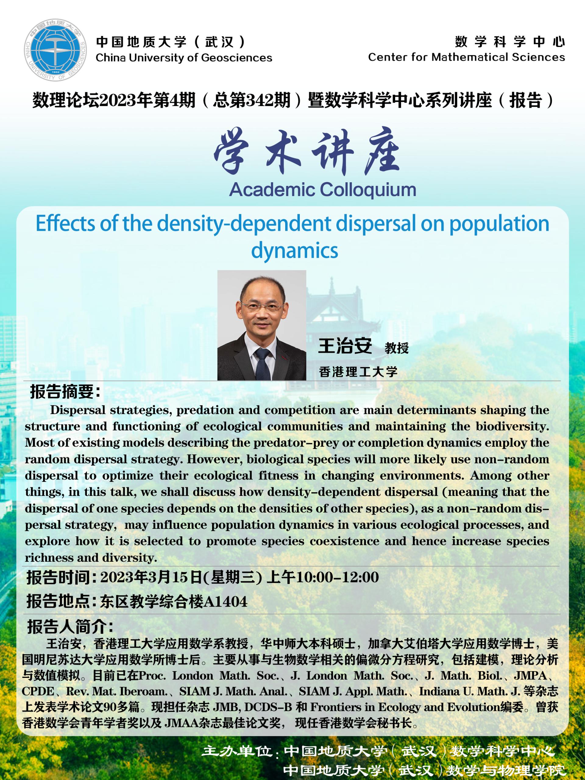 2023年3月15日王治安教授学术讲座:Effects of the density-dependent dispersal on population dynamics