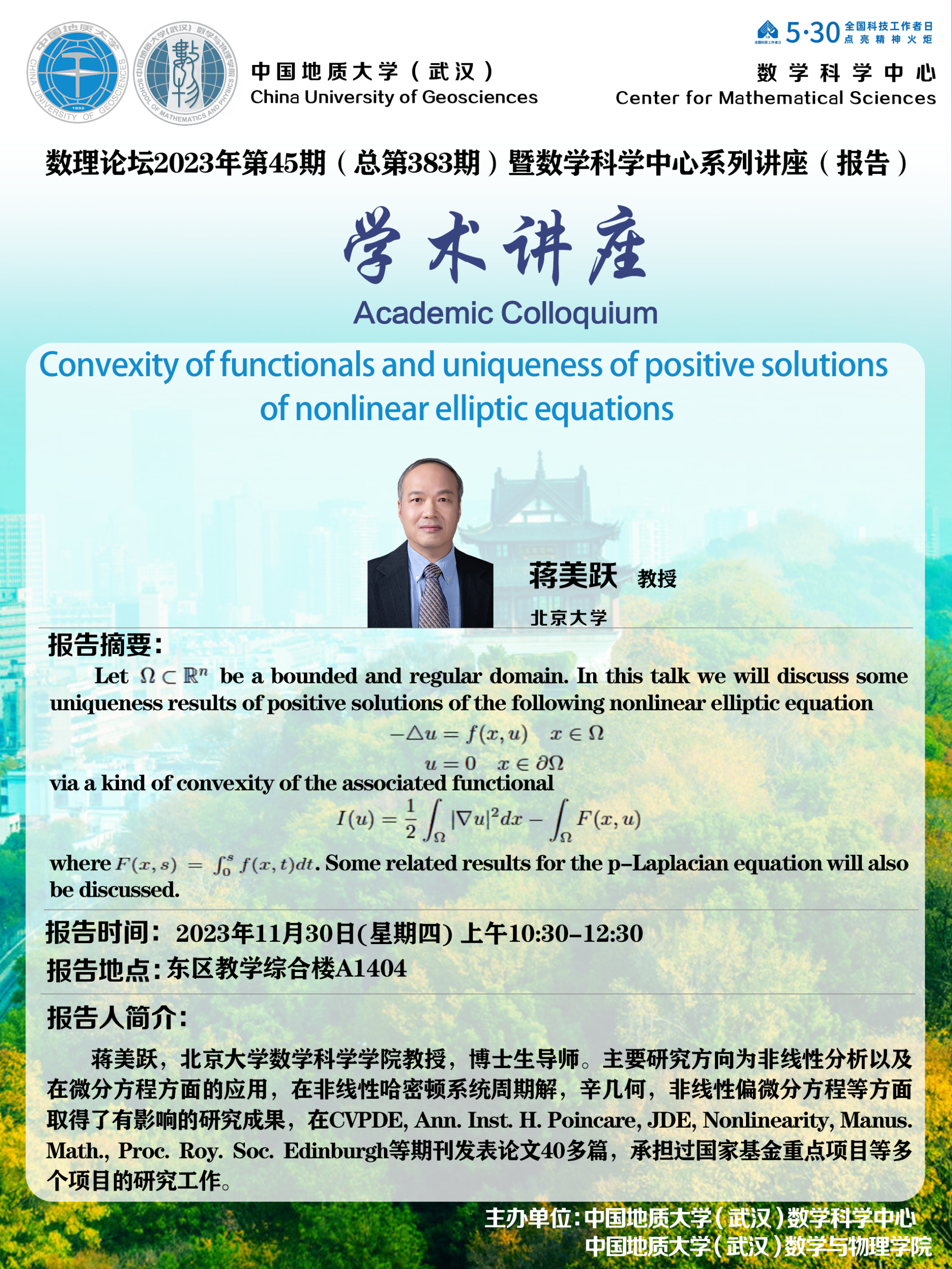 2023年11月30日蒋美跃教授学术讲座:Convexity of functionals and uniqueness of positive solutions of nonlinear elliptic equations