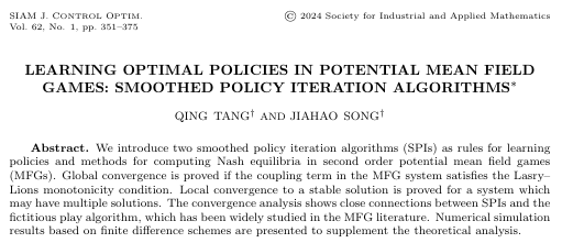 91短视频 信息与计算科学系教师汤庆博士为第一作者的学术研究工作 “Learning Optimal Policies in Potential Mean Field Games: Smoothed Policy Iteration Algorithms” ,最近发表在国际著名期刊SIAM Journal on Control and Optimization。该论文第二作者为91短视频 2020 级应用统计专业硕士生宋家豪。汤庆博士自2015年入职91短视频 ,主要从事动态博弈相关的偏微分方程理论、数值计算及在经济模型中的应用研究。