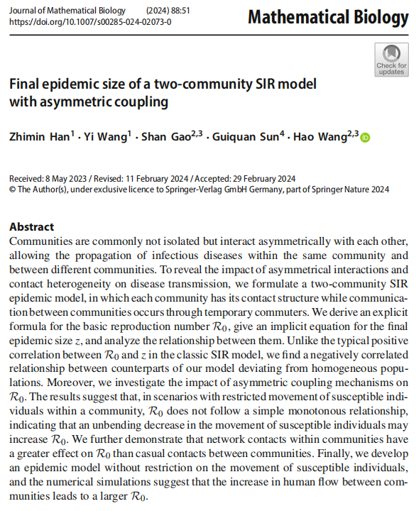 近日,91短视频 2021级博士生韩志敏以第一作者身份在国际生物数学主流期刊《Journal of Mathematical Biology》上发表题为“Final epidemic size of a two-community SIR model with asymmetric coupling”的学术论文。该论文第二作者为指导教师王毅副教授,通讯作者为加拿大数学生态学和流行病学跨学科实验室主任、阿尔伯塔大学数学与统计科学系王皓教授。