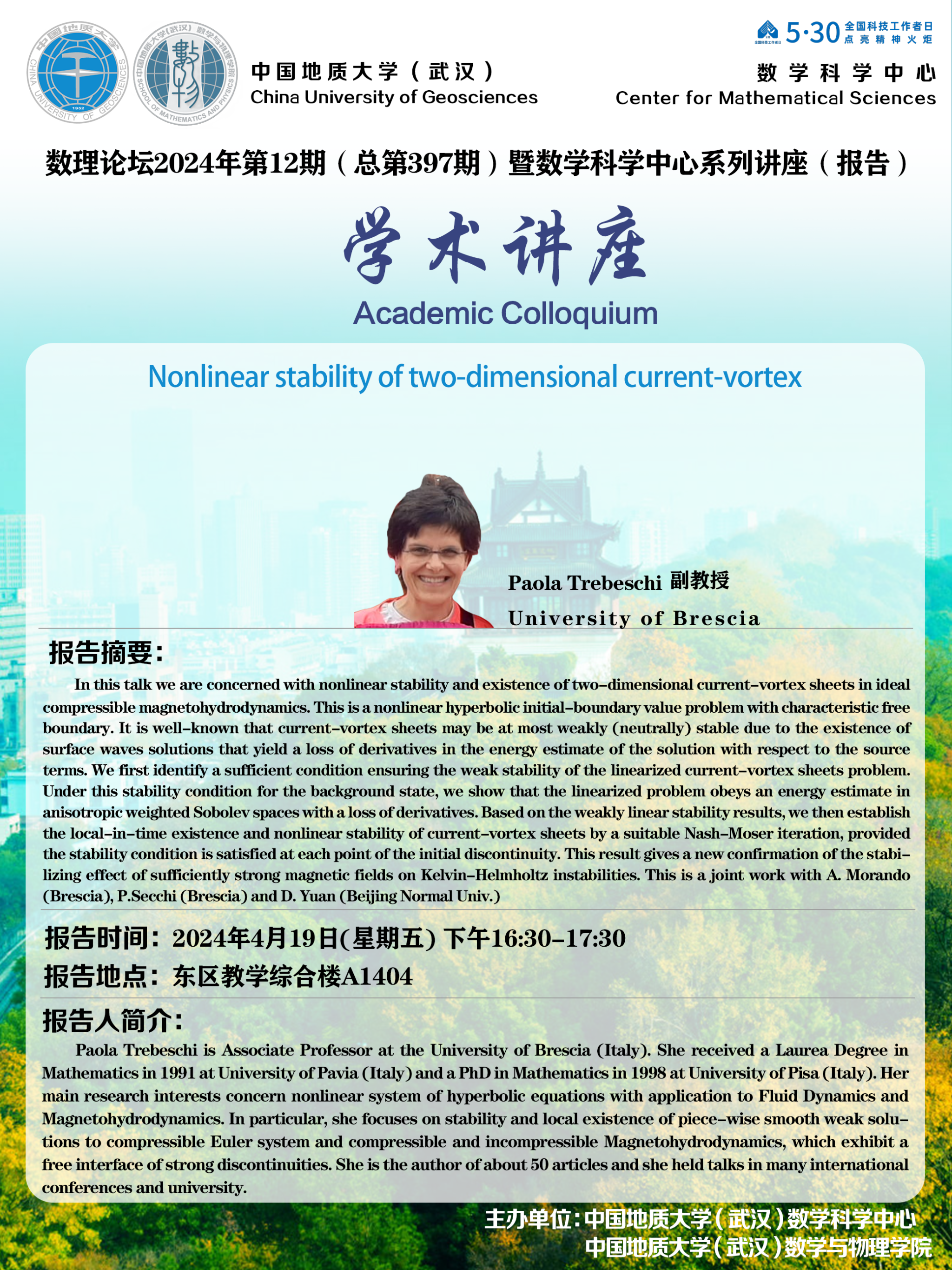 2024年4月19日Paola Trebeschi副教授学术讲座:Nonlinear stability of two-dimensional current-vortex
