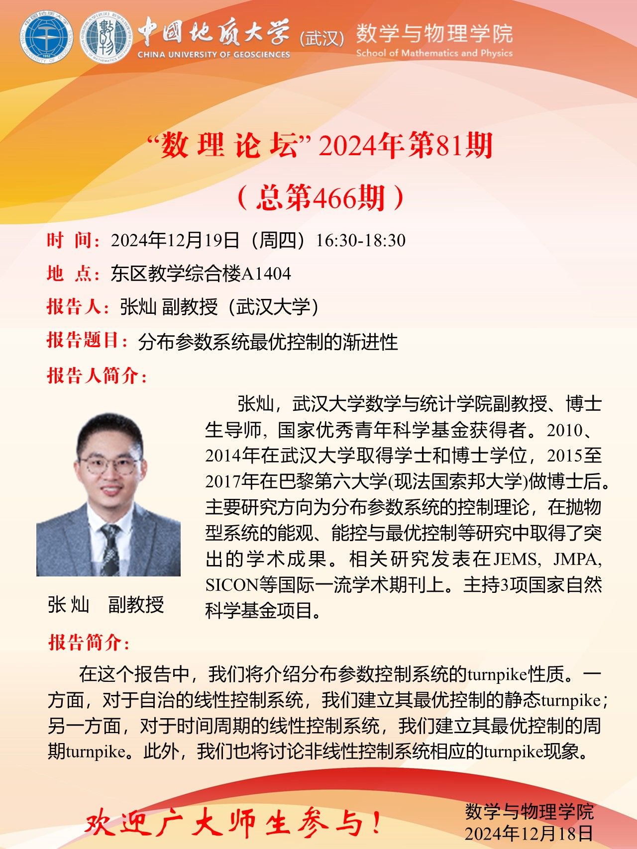 2024年12月19日张灿副教授学术讲座:分布参数系统最优控制的渐进性