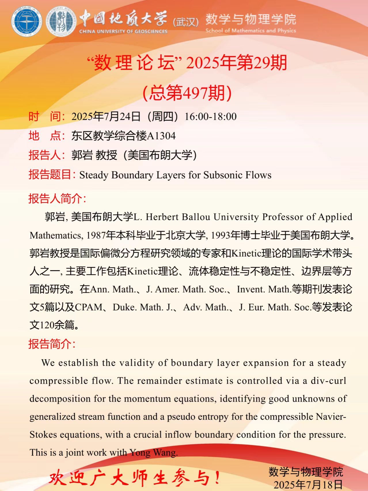 2025年7月24日郭岩教授学术讲座:Steady Boundary Layers for Subsonic Flows