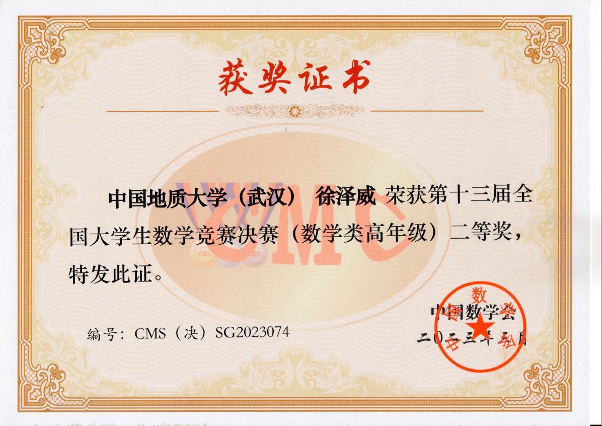 3月24日—26日,由中国数学会主办,华东师范大学承办的第十三届全国大学生数学竞赛决赛举行,91短视频 徐泽威同学获得数学专业组(高年级)二等奖。