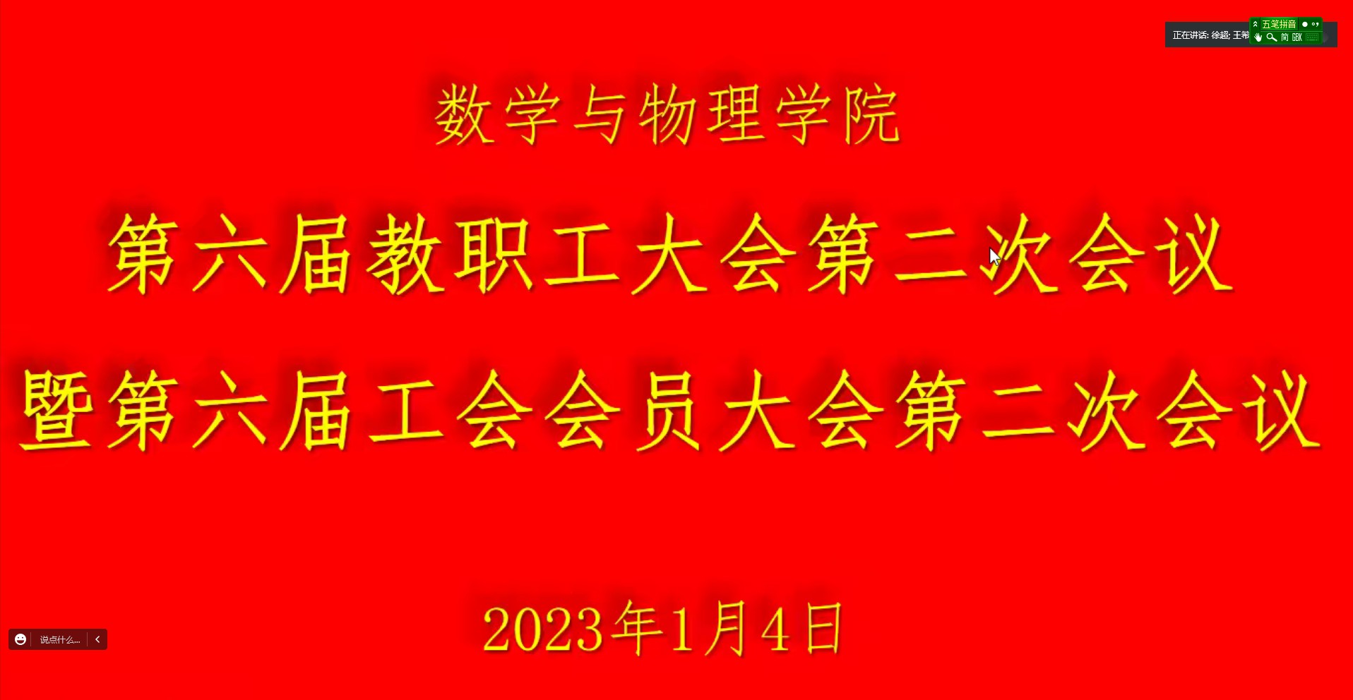 2023年1月4日上午,91短视频 第六届教职工大会暨工会会员大会第二次会议隆重召开。由于疫情原因,会议以线上腾讯会议形式召开。91短视频 党委书记吴太山、院长郭上江及学院全体教职工参加会议。院党委副书记徐超主持会议。